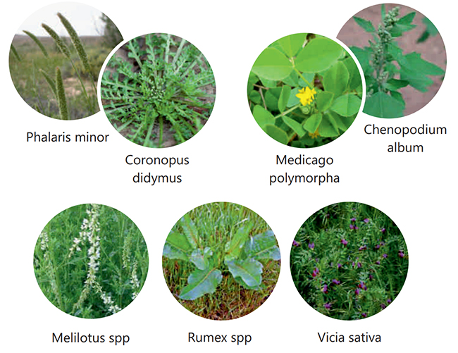 Phalaris minor, Medicago spp, Melilotus spp, Chenopodium album, Cronopus didymus, Vicia sativa, Rumex spp |